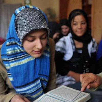 Afghan teacher Meher Afroza (R) teachs K